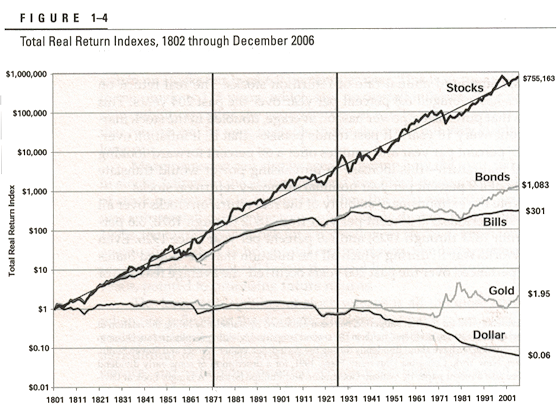 Here is a picture of the comparable performance of Stocks, Bonds, Bills, the Dollar and Gold over the last 200 years taken from Stocks For the Long Run by Dr. Jeremy Siegel, Wharton Professor of Finance.